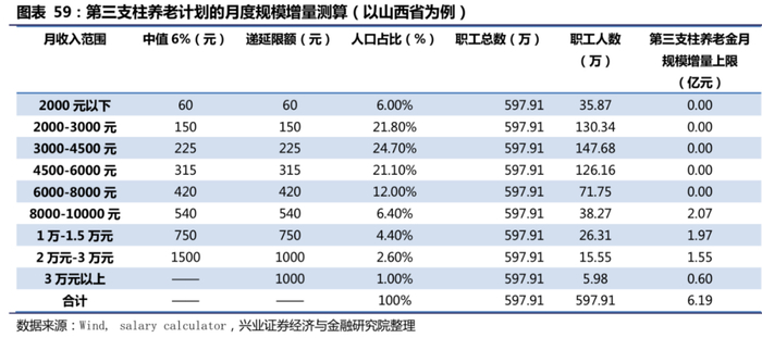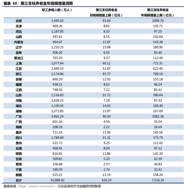 下文对第三支柱养老金给养老金体系带来的增量规模进行测算,测算的核心假设包括:1)以参加城镇职工基本养老保险的职工作为第三支柱的潜在参与群体;2)以salary calculator平台发布的《2020年全国各大城市薪资水平报告》中各省会城市就业人群工资水平分布作为各省就业人群工资水平分布的替代。3)2019年,个税免征额被上调为5000元,在此背景下,又将住房、子女教育、赡养老人等多项可抵税的支出考虑在内,参考《中国养老金融发展报告2018》,假定月收入在8000元以上者能够实际享受养老个税递延优惠,因此在测算时,我们假设月收入在8000元以上的人群均参与商业保险来获得规模上限。根据各省市城镇职工基本养老保险参加人数与salary calculator平台统计的全国各大城市薪资分布,分省测算各地去的第三支柱个人养老金规模,最后加总得第三支柱养老金给我国养老金体系带来的总体增量规模。