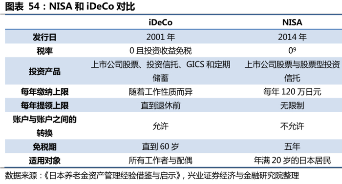 从激励发展的政策上来看,日本当前对NISA和iDeCo都采取税收优惠与扩大受益范围的激励政策。税收优惠方面,日本对NISA和iDeCo的领取税率都为0,且iDeCo的投资收益税率为0,在日本资本利得税超过20%的背景下,NISA的投资收益免税账户吸引力凸显。扩大受益范围方面,日本推出Junior NISA,使NISA受益范围扩大到未成年人,并通过改革iDeCo,将参与者的适用范围扩大至公务员与家庭主妇,进而拓展了养老金第三支柱的覆盖人群。