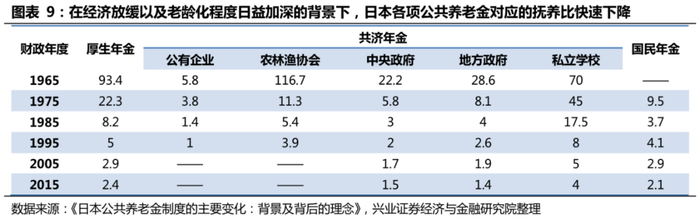 然而,在老龄化日趋严重与经济增速放缓的双重影响下,公共养老金的收支压力也逐步增大。早期领取公共养老金的老年群体,从经济高速增长中获益。而随着经济增速的放缓,以及老龄化的日趋严重,公共养老金的收支压力也逐步增大,从而给后代带来负的转移支付。以日本公共养老金为例,随着日本20世纪60-70年代的高速增长期结束以及逐渐步入老龄化社会,日本各大公共养老金(国民年金、厚生年金、共济年金等)的领取者人数迅速增长,如国民年金的领取人数由1975年的273万提升到2015年的3096万,而对应的抚养比(注:抚养比即当期被保险人人数/养老金领取人数)则由1975年的9.5下降到2015年的2.1,增大了应对老龄化压力的难度。