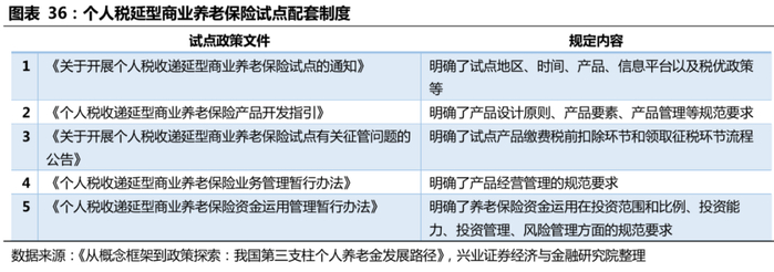 在第三支柱建设中,当前仅保险纳入税优范围,并出台配套制度,商业养老保险先发优势显著。自2018年4月启动税延个人养老保险试点后,有且仅有保险产品被纳入税收优惠范围。同时,在试点启动后,《关于开展个人税收递延型商业养老保险试点的通知》、《个人税收递延型商业养老保险产品开发指引》、《关于开展个人税收递延型商业养老保险试点有关征管问题的公告》等一系列配套政策文件下发,明确了试点地区、时间、产品、信息平台以及税优政策等基本要素,进一步巩固了养老保险的先发优势。