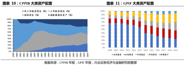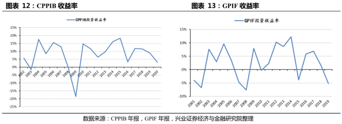 为缓解公共养老金的收支压力,国家政府或将公共养老金投入资本市场,但对公共养老金的投资往往要面对政府施加的压力,阻碍保值增值。通过将公共养老金投入资本市场以寻求保值增值,进而缓解公共养老金收支压力的做法日益普遍,而加拿大的CPPIB便是其中的成功范例。加拿大政府建立了完全市场化运作的CPPIB,用以管理公共养老金计划CPP,截至2020财年,CPPIB的10年年化名义收益率达到9.9%,从资本市场获得了可观的投资收益。然而,将公共养老金投入资本市场,也很有可能面对来自政府的压力,如日本的GPIF。日本厚生劳动省仍然影响着GPIF的人事任免、经营目标、投资配置计划等,并倾向于将退休官员提名为GPIF的理事长,制约了GPIF的进一步市场化。而GPIF保值增值的潜力也受到行政化力量的限制,以权益资产的配比为例,2019财年,CPPIB的权益资产占比已高达56.9%,2002-2019财年的收益率均值高达8.46%;而GPIF仅为46.77%,2002-2019财年的收益率仅为2.82%,入市进程有待加速。