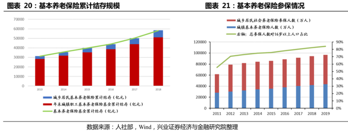 基本养老保险是我国养老金第一支柱的主体部分,具有规模大、覆盖面广的特点,而社会保障基金起补充作用。我国养老金第一支柱包括基本养老保险和社会保障基金,截至2019年底,我国基本养老保险规模达到6.29万亿元,而社会保障基金规模达到2.63万亿元,基本养老保险占主体,而社会保障基金则起到补充作用。2011-2019年间,基本养老保险参保人数对16岁以上人口占比规模从55.49%上升到84.11%,覆盖面广。