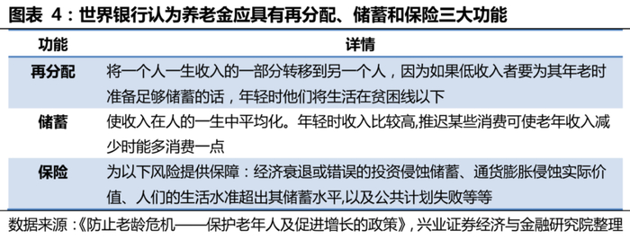 世界银行于1994年提出养老金三支柱体系,以实现养老金体制的再分配、储蓄和保险三大功能。世界银行认为,一个国家的老年保障计划应具有储蓄、再分配和保险功能,而单一的养老金支柱无法实现这三大功能。因此,各国应建立由多层次的养老金筹资和管理体制,由多重老年保障支柱来分担养老责任。1994年,世界银行发布报告《防止老龄危机——保护老年人及促进增长的政策》,明确提出养老金三支柱体系:第一支柱为强制性税收融资的公共支柱,主要负责实现再分配功能;第二支柱为强制性积累的私人支柱(职业年金计划或个人储蓄),主要负责实现储蓄功能,而第三支柱为自愿支柱,对第一支柱与第二支柱起到补充作用。