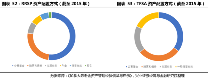 RRSP和TFSA可配置多种投资品,其中公募基金是最主要的配置方式,入市程度高。加拿大监管机构对RRSP和TFSA均规定了合格投资品和非合格投资品。合格投资品包括货币、担保投资凭证、政府债券公司债券、共同基金、公司分红以及其他在股票市场上可以交易的证券,其他为非合格投资品,对境内外资产的投资限制于2005年取消。截至2015年,RRSP配置的公募基金占比高达52%,而股票和债券占比约为25%,定期存款、年金和储蓄存款占比分别为8%/7%/6%,其余占比约为2%。而在TFSA中,公募基金的投资占比也达到35%,股票和债券占比为29%,定期存款与一般储蓄存款占比均为18%。RRSP和TFSA的最主要投资品均为公募基金,说明了第三支柱养老金是机构化进程的重要驱动力。