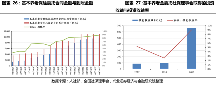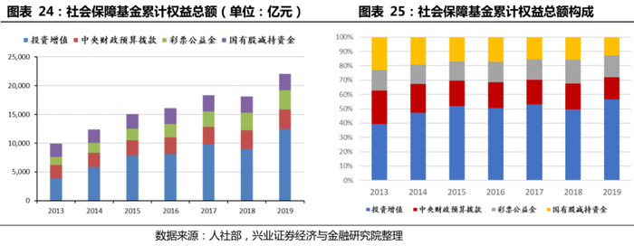 社会保障基金累计投资收益已超过万亿元,但占大头的基本养老保险入市程度低,通过投资增值以缓解收支压力的贡献程度仍待加强。社会保障基金方面,从权益总额的口径来看,截至2019年,累计投资增值已达到12464.06亿元,一定程度上缓解了财政压力。但占主体的基本养老保险方面,截至2020年三季度,基本养老保险委托社保理事会投资的金额共到账9757亿元,对基本养老保险总规模占比不足15%,入市程度低。而2019年基本养老保险委托社保理事会投资所获得的投资收益仅为663.86亿元。因此,受基本养老保险的低投资回报影响,总体来看,当前我国第一养老金支柱通过投资增值以减轻财政负担的能力仍有限。