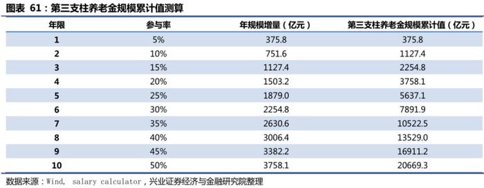 6.如果我们按照基本养老保险参与率的增速来测算第三支柱养老金参与率的增速, 10年内第三支柱养老金累计规模将增长至2万亿元。2011-2019年间,基本养老保险参与率(参与人数/16岁以上劳动人口)每年平均增长3.58%。考虑到第三支柱养老保险初期参与率上升较快,我们假设第三支柱养老保险每年的参与率增长5%,略高于基本养老保险的参与率增长,测算得5年内第三支柱养老金累计规模将增长至5637.1亿元,而10年内第三支柱养老金累计规模将增长至20669.3亿元。