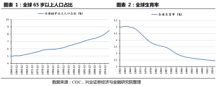 20世纪90年代,老龄化趋势逐步加剧。自1960年至1994年,全球65岁以上人口占比由4.97%上升到6.46%,逐步逼近7%[1],而全球生育率从4.98%下降至2.92%。与此同时,人口预期寿命已由1960年的52.58岁上升到1994年的66.09岁,进一步加剧全球的老龄化压力。