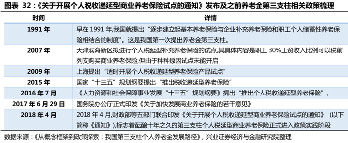 我国养老金第三支柱建设起步晚。早在1991年,我国就提出“逐步建立起基本养老保险与企业补充养老保险和职工个人储蓄性养老保险相结合的制度“。这是我国第一次提出养老金第三支柱。在十三五规划期间,《“十三五”规划纲要》、《人力资源和社会保障事业发展“十三五”规划纲要》等重要文件又多次提及“推出个人税收递延型养老保险”。2018年4月,财政部等五部门联合印发《关于开展个人税收递延型商业养老保险试点的通知》,宣布自2018年5月1日起,在上海市、福建省(含厦门市)和苏州工业园区实施个人税收递延型商业养老保险试点,试点期暂定一年。这一举措标志着养老金第三支柱建设正式进入政策实践阶段。