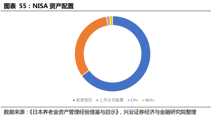 从资产配置情况来看,iDeCo和NISA的可投资品种均为偏股型。iDeCo的投资品种包括上市公司股票、投资信托、GICS和定期储蓄,而NISA的可投资品种包括上市公司股票与股票型投资信托。以NISA的资产配置为例,截至2015年,NISA对投资信托/上市公司股票/ETFs/REITs的投资占比分别为65.1%/32.2%/1.4%/1.2%,投资信托的资产配置占绝对主导。