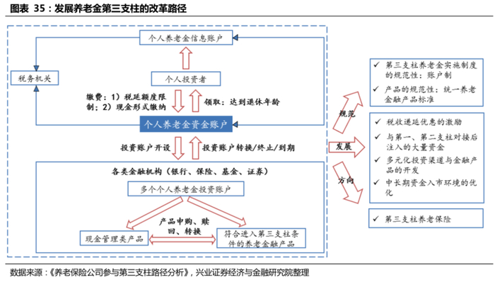 改革方向之三——发展:通过税收优惠+三支柱对接+多元化金融产品开发+中长期资金入市环境优化等多举措,助推第三支柱养老金发展