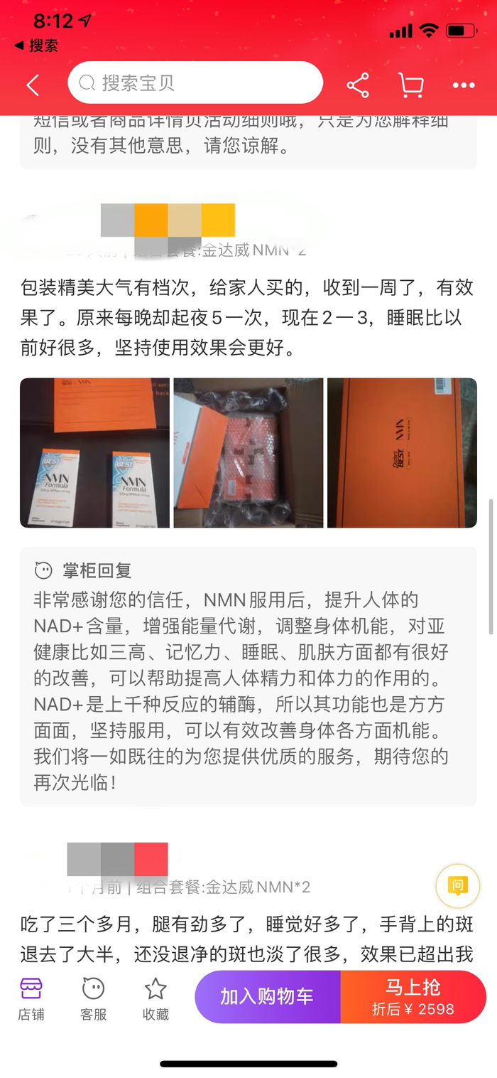 还有店家明确表示:按照中国相关法律法规,NMN(β-烟酰胺单核苷酸)不属于保健食品、药品、新资源食品、产品的配料表上不能直接注明NMN,介意者慎拍。