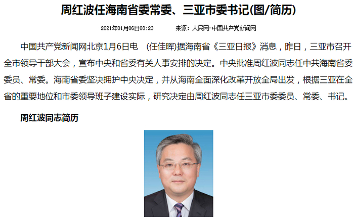 有人离开海南,也有人来到海南。1月4日,据海南新闻联播,中共中央日前批准:周红波同志任中共海南省委委员、常委。1月5日,周红波被任命为三亚市委委员、常委、书记。去年11月,时任海南省委常委、三亚市委书记童道驰落马,三亚市委书记一职空缺。