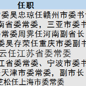 有人跨省履新,也有人常年深耕一省,例如新任重庆市委副书记吴存荣和新任浙江省委常委、宁波市委书记彭佳学。