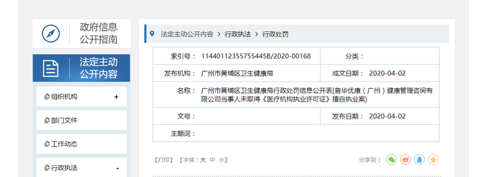 企查查显示,普华优康(广州)健康管理咨询有限公司成立于2019年2月,法定代表人为田秀珍,注册资本500万元,经营范围显示为:边境旅游招徕、咨询服务;出境旅游招徕、咨询服务;社会福利事业信息咨询服务;投资咨询服务;社会法律咨询;法律文书代理;医院管理;医疗、医药咨询服务(不涉及医疗诊断、治疗及康复服务);健康管理咨询服务等。