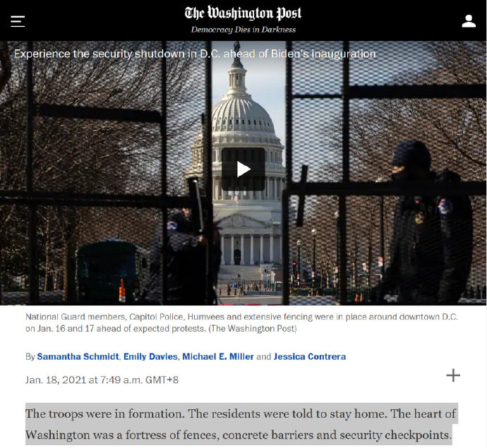 “华盛顿进入了战时体制。”美国《国会山报》记者描述称,“如今的华盛顿看上去像一座武装营地”。