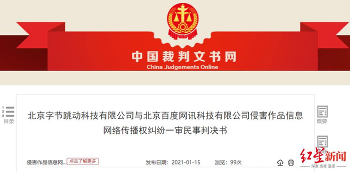 原标题:字节跳动告百度侵害信息网络传播权,法院判赔40元