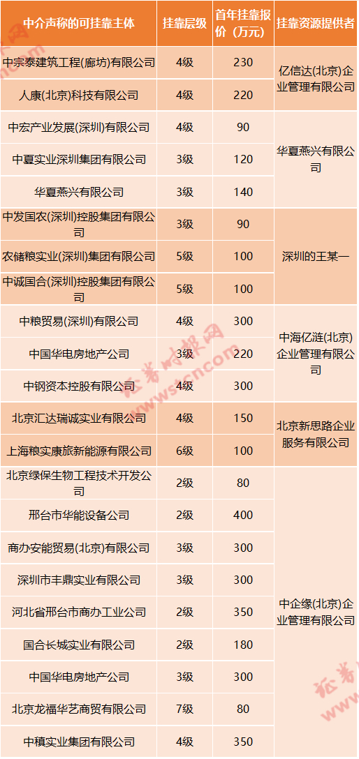 中介机构及掮客声称可挂靠的大型央企资源多达10余家,可挂3-7级子公司,报价在80万-400万元之间。