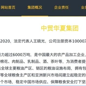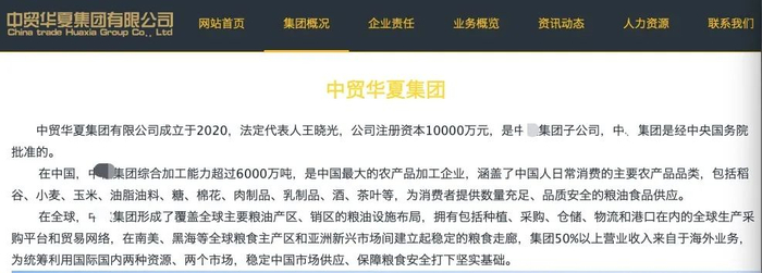 中贸华夏则略显高调。该公司2020年5月成立,起初亦由自然人持股,同年11月4日股东变更为王晓光,6天后又变更至中粮贸易深圳公司名下。2020年11月25日,王晓光创建了中贸华夏网站“http://www.zmhxjt.cn/”,对外介绍公司为央企子公司。
