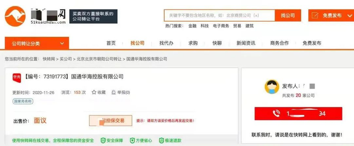 2020年7月28日,国通华海控股有限公司(下称“国通华海控股”)成立,法定代表人姚某。姚某实际为某提供工商注册服务的企业管理公司人员,国通华海控股即由他们注册。姚某及他的同事在多个网站上发布了出售“国通华海控股”等壳公司的讯息,称目前“控股”公司是不能注册的,只能收购,然后变更到自己名下。另外,“国字头”、无经营、干净壳也被列为国通华海控股这类公司的卖点。