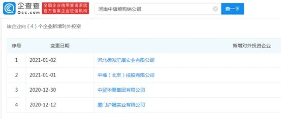或是迫于声明施加压力,或是中粮方面真的采取了实质性动作,在2020年的最后关头,中福控股、中贸华夏将自己的工商登记股东由中粮贸易深圳公司变更为了河南中储粮购销公司。证券时报记者还发现,除了上述两家企业,河南中储粮购销公司在2020年12月名下还新增了全资子公司厦门沪晟实业有限公司、河北德泓汇康实业有限公司。