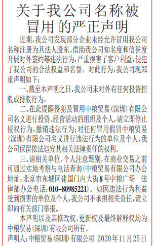 中粮贸易深圳公司声明,从未对中贸华夏、中福控股有任何投资行为,提醒侵犯及冒用公司名义进行投资、经营活动的组织及个人立即停止侵权行为,撤销不法行为。