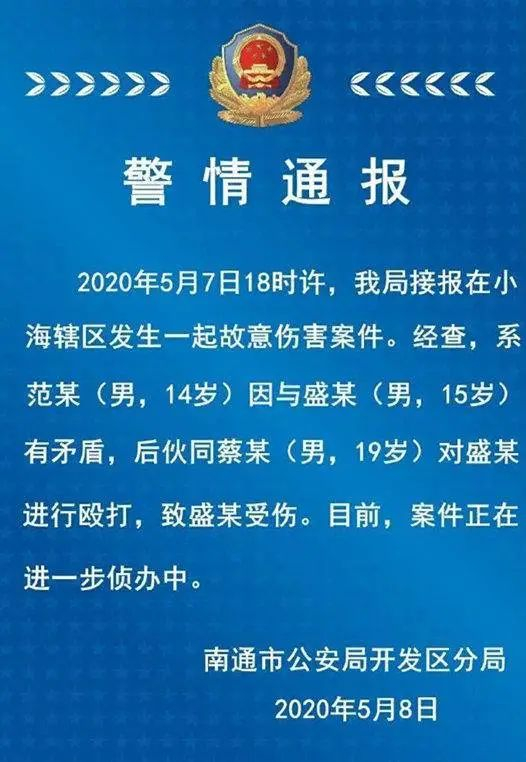根据南通市人民检察院的起诉书显示,5月6日晚,被告人范某与小盛等人在微信群表示欲教训该校初一年级某男生,后小盛将此信息告知了两人的朋友胡某,引起胡某对范某的不满,被告人范某遂对小盛怀恨在心欲予报复。