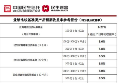 界面新闻记者从业内获取了多份民生财富尊系列说明材料。据了解,该产品根据投资期限不同分为尊享系列(3个月)、尊悦系列(6个月)、尊逸系列(12个月),投资的投资门槛为100万元,收益逐级递增,尊逸系列的收益在8%以上。