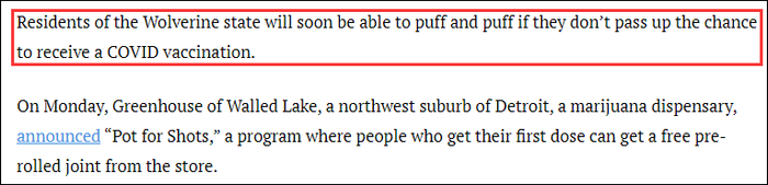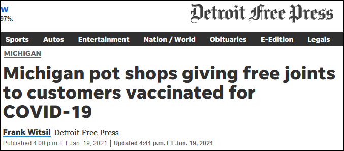 综合密歇根州底特律市最大日报《底特律自由报》(Detroit Free Press)及当地网络媒体“MLive”的消息,“一针疫苗一根大麻”的活动将会在当地时间1月22日至2月28日期间展开,面向所有持有有效身份证件的21岁及以上人士。