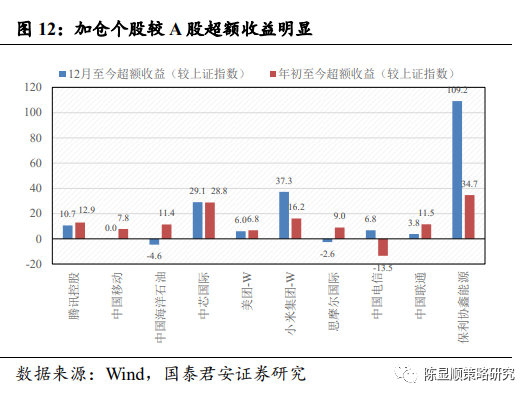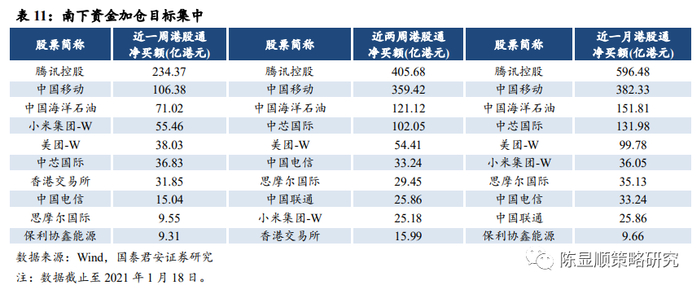 南下资金近期集中加仓哪些个股?——近期南向资金净买入额较高的个股均为大市值蓝筹。从近一个月(2020-12-18 至 2021-01-18)港股通净买入额来看,腾讯控股、中国移动、中国海洋石油持续占据前三,其中近一个月腾讯控股港股通净买入额达到了 596.48 港元。从近期大幅加仓的个股表现来看,较上证指数均具备明显超额收益。