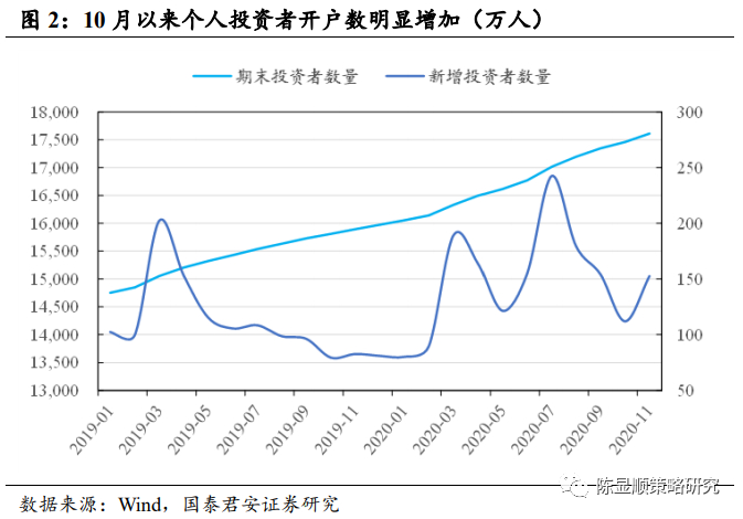 个人投资者也是南下重要力量。对于个人投资者,开通港股通权限可以线上完成,开通港股通交易需要同时满足几个条件:1、开户满 20 个交易日;2、申请开通港股通前 20 个交易日日均证券类资产为 50 万人民币及以上(不包括两融交易融入的资金和证券);3、通过港股通知识测试;4、无严重不良记录,无法律、行政法规、部门规章、规范性文件赫尔业务规则禁止或者限制参与港股通的情形。个人投资者证券开户数在 2020 年 7 月达到近两年高点后一路回落,10 月份新增开户 112 万户,随后开始反弹,11 月份新增开户 153 万户,随着 2020 年底 A 股赚钱效应提升, 预计新增开户数边际仍将增长,港股赚钱效应带来的港股通开户数量也有望同步提升。