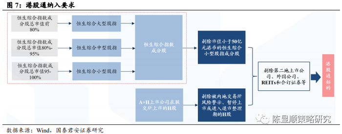 1)成为恒生综合指数成分股:包括恒生综合大型股指数成分股、恒生综合中型股指数成分股。同时深交所允许过去 12 个月平均月末流通市值不低于 50 亿港元的恒生综合小型股指数成分股纳入深港通。