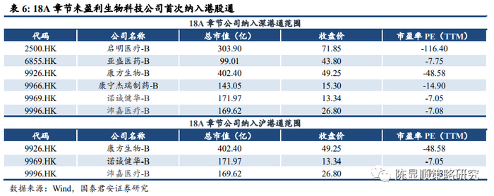 二次上市虽仍未放开,但未盈利生物公司近期已放开。继 2018 年未盈利生物公司可于香港上市 IPO 新政之后,港交所于 11 月 27 日宣布科创板股票、在港上市的 18A 章节生物科技公司纳入港股通。《主板上市规 则》第18A章节上市的生物科技公司的股票,若其属于相关恒生综合指 数成分股或沪深港交易所上市的 A+H 股上市公司 H 股,该股票将根据沪深港通现有规定调入港股通股票范围。12 月 25 日深交所公告 6 家 18A 章节公司纳入深港通范围,于 12 月 28 日生效。同时上交所亦公告将纳入港股通。