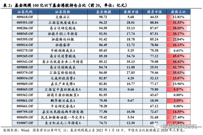 中小规模的头部公募基金港股占比平均为19.8%。基金规模 100 亿元以下的前 20 家公募基金中,港股占比最大的是易方达消费精选,占比达45.07%,占比最小的是招商丰盈积极配置 A 和平安研究睿选 A,均无港股持仓,整体平均港股持仓占股票市值的比例为 19.8%,相较 50%的持仓上限有较大空间,且与规模100亿以上基金的平均持仓占比差别不大。