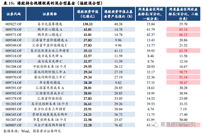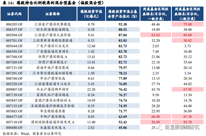 从持仓港股比例最高的 20 只混合型基金(偏股混合型)来看,12月初以来收益亦靠前。20 只港股高持仓基金中,共有 17 只基金在混合型基金中排名前 50%之内,共有 14 只基金在偏股混合型基金中排名前 50% 之内。