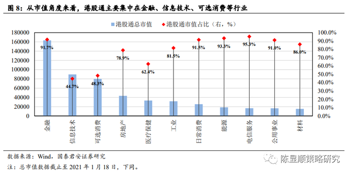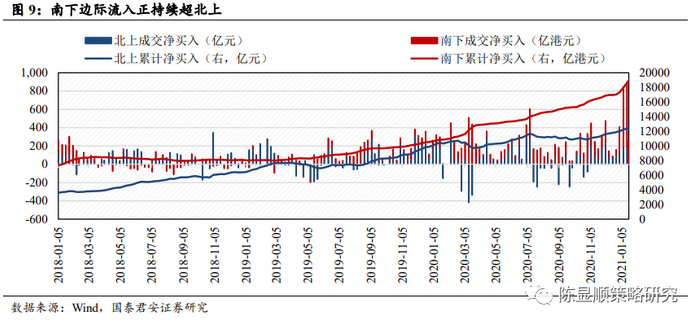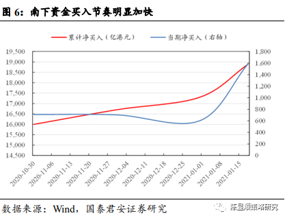 南下资金对港股上涨贡献度显著增加。南下资金累计买入额从2020 年12 月1日的 1.67 万亿港元,增加到 2021年1月18日的 1.89 万亿港元,增量为 2189 亿港元;同期港股通标的市值从 54.72 万亿港元增加至 59.64 万亿港元,市值增加 4.92 万亿港元,从贡献度看,南下资金贡献增量市值的 4.45%,按照同样的逻辑计算 2020 年10月1日至 2020 年12月1日的南下资金市值贡献度为 2.2%。南下资金呈加速流入态势,但同时应考虑全球流动性宽裕背景下,全球配置型资金对港股通标的的加仓行为。