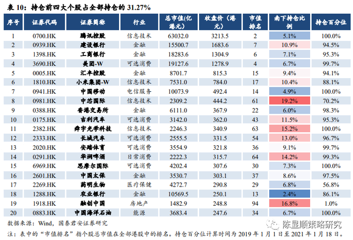 公募视角看南下赚钱效应:顺势而为,渐入佳境。1)当前南下流入持续加速:2021年1月4日以来,南下资金单日净买入持续保持在100亿港元以上,1月18日与1月19日净流入额连破记录。2)南下持仓结构集中:从行业来看,南下资金目前集中在银行、传媒、电子等行业,占全部持仓的43.86%。从个股来看,腾讯控股、建设银行、工商银行、美团四大个股持仓总规模高达7480.9亿,占全部持仓的31.27%,资金集中于头部个股。3)已配置港股基金近期收益表现优异:2020年Q3已重仓港股的基金近期收益排名表现优异。普通股票型基金、偏股混合型和QDII(股票型)基金各自持仓港股比例最高的20只基金自12月初以来收益排名均靠前。