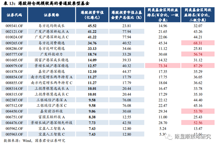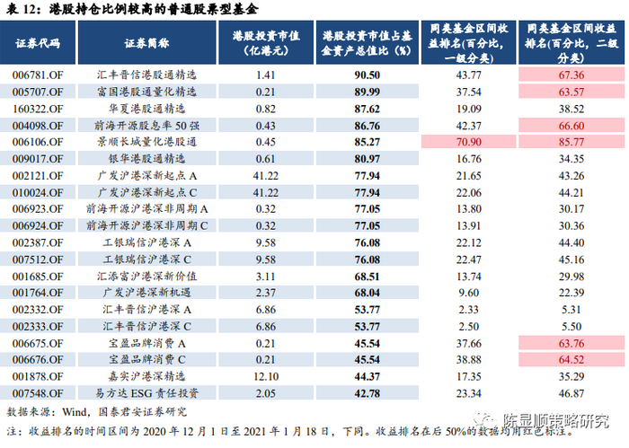 从持仓港股比例最高的 20 只普通股票型基金来看,12 月初以来收益靠前。20 只港股高持仓基金中,共有19只基金在股票型基金中排名前50%之内,共有14只基金在普通股票型基金中排名前 50%之内。