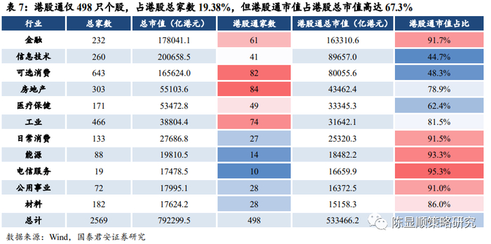 公募视角看港股通标的结构:进一步集中投资火力。纳入港股通需要符合以下两个要求之一:1)成为恒生综合指数成分股(包括恒生综合大型股指数成分股、恒生综合中型股指数成分股,同时深交所允许过去12个月平均月末流通市值不低于50亿港元的恒生综合小型股指数成分股纳入深港通);2)A+H股上市公司在联交所上市的H股。REITs、二次上市公司、外国公司、合订证券等虽可被纳入恒生综指标的,但仍未被许可纳入港股通。港股通标的大市值特征明显,且行业分布集中,进一步集中投资火力:1)港股通当前仅498只个股,仅占港股总数的19.38%,但市值占港股总市值高达67.3%,港股通标的大市值特征明显。2)从港股通市值的行业分布来看,主要集中在金融、信息技术、可选消费行业,三行业市值占全部港股通市值的62.43%。3)港股通前20大市值个股中,金融股与AH股占比高。