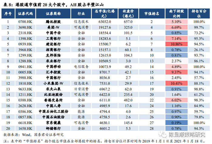 港股通前 20 大市值个股,金融股/AH 股占半壁江山。从港股通市值前 20 大个股来看,呈现两个特征。1)行业结构上,金融行业占据半壁江山。市值前 20 大个股中,金融行业共有 11 家,占比较高,其余信息技术(2)、可选消费(3)、能源(2)、日常消费(1)、电信服务(1)占比均较低。2)AH 股亦有较高的占比。在市值前 20 大个股中,AH 股共 有 11 家,占比亦较高。