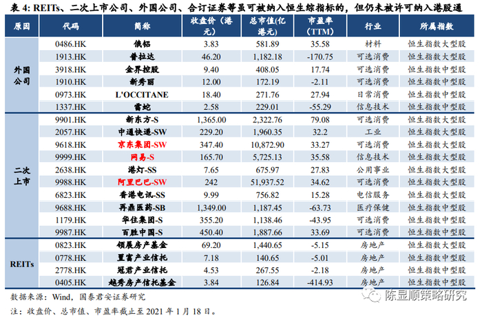 注意:REITs、二次上市公司、外国公司、合订证券等虽可被纳入恒生综指标的,但仍未被许可纳入港股通。