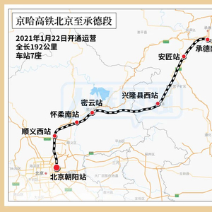其中沈阳至哈尔滨段已于2012年12月1日开通运营,承德至沈阳段已于2018年12月29日开通运营。此次开通的北京至承德段长192公里,设北京朝阳、顺义西、怀柔南、密云、兴隆县西、安匠、承德南7座车站。