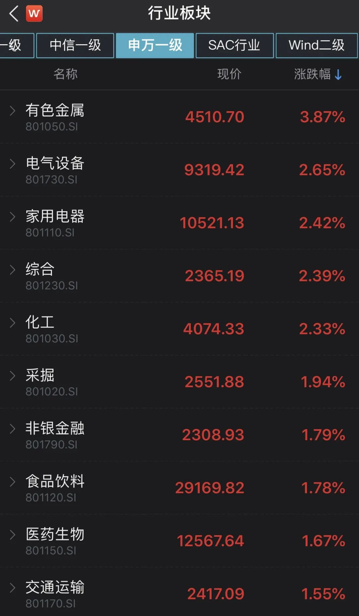 从行业板块看,申万一级28个行业板块午间收盘时多数走高,呈现普涨。其中,有色金属、电气设备、家用电器板块涨幅居前;仅有房地产、休闲服务、通信板块下跌。