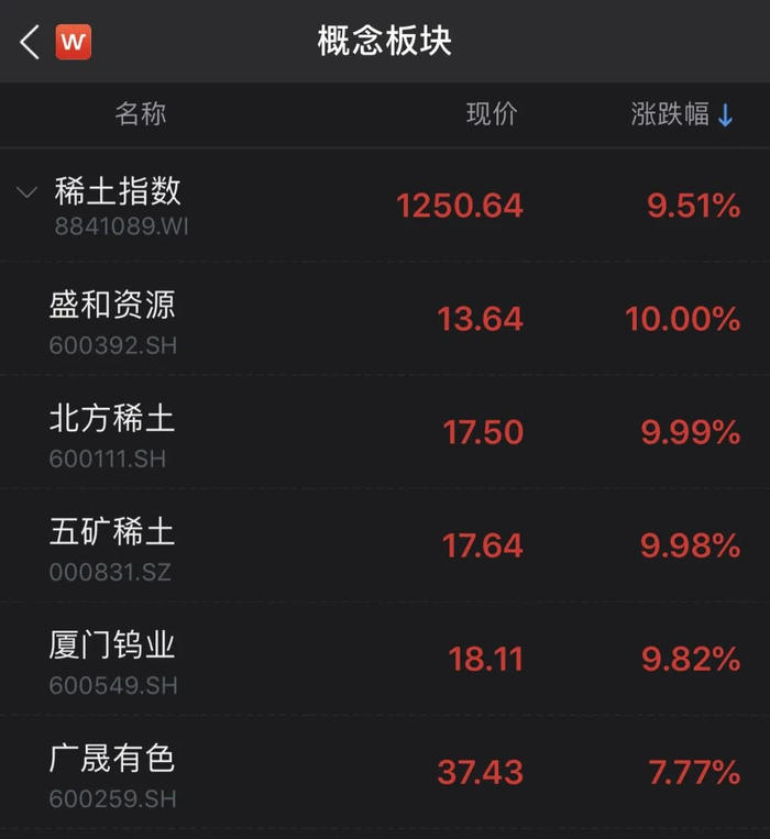 相关个股中,盛和资源、北方稀土、五矿稀土涨停,厦门钨业涨9.82%,广晟有色涨7.77%。