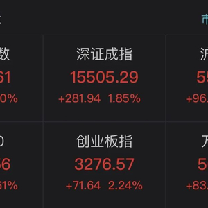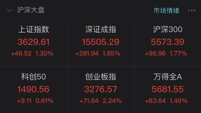 据Wind数据,截至午间收盘,上证指数涨1.30%,报3629.61点;深证成指涨1.85%,报15505.29点;创业板指涨2.24%,报3276.57点。