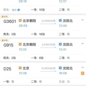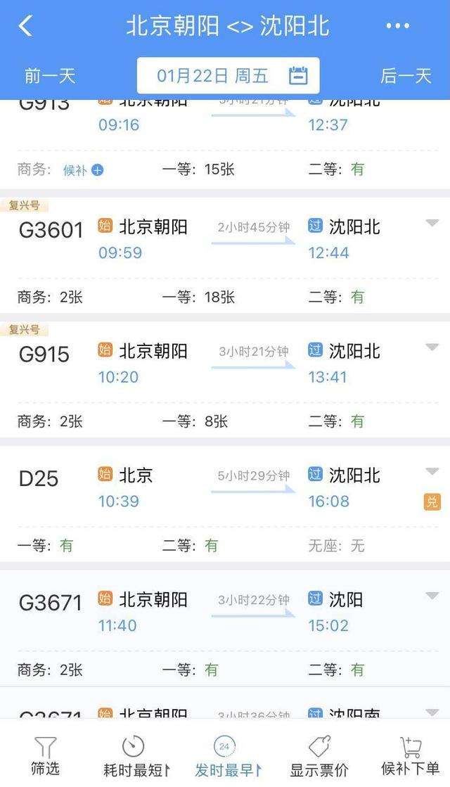 票价:22日当日,沈阳到北京朝阳二等座 339 元!
