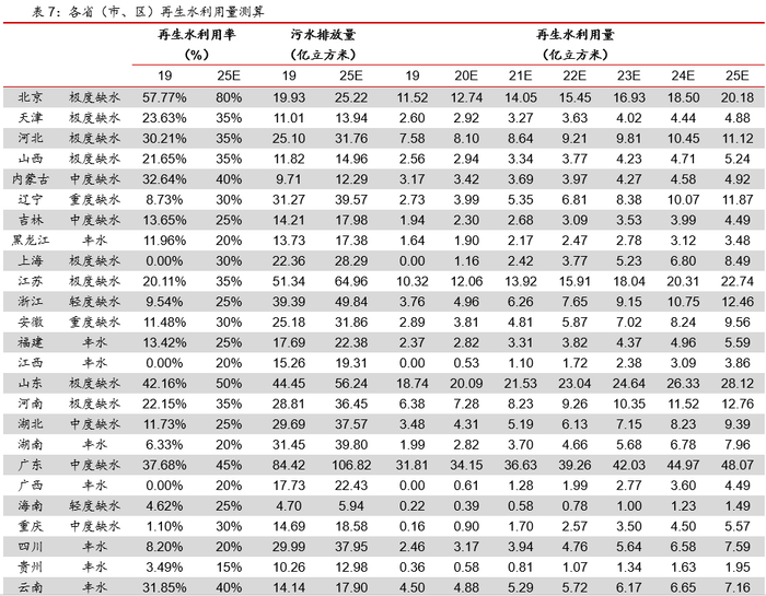 缺水地区:《建设规划》要求2020年缺水城市再生水利用率为20%,假设2025年轻度缺水/中度缺水/重度缺水/极度缺水地区的利用率分别为25%/30%/35%/40%,并根据各地经济发达情况及目前再生水利用率情况,对目标再生水利用率进行调整;