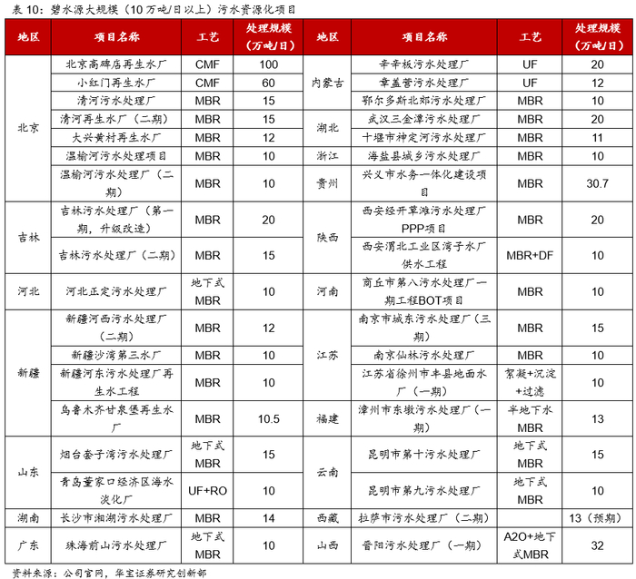 公司具有完全自主知识产权的全产业链膜技术(微滤、超滤、纳滤、反渗透)包括产品生产与工艺应用,也是中国唯一一家集全系列膜材料研发、全系列膜与设备制造、膜技术工艺应用于一体的企业,现已发展为全球最全的膜产品生产商之一和先进的环保设备制造商之一;公司目前是世界上承建大规模(10万吨/日以上)MBR工程最多的企业。根据公司官网信息统计,公司日处理规模10万吨/日以上的污水资源化项目共36个,总处理规模达630.2万吨/日,项目工艺多采用MBR技术,规模占比达64.3%。