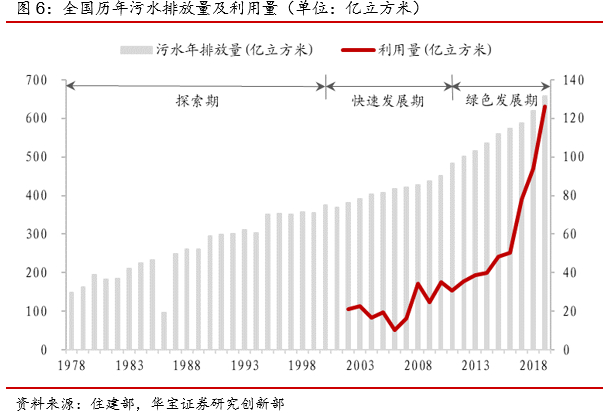 第四阶段——绿色发展期(2012年至今):污水处理率接近饱和,再生水等纳入水资源统一配置。该阶段我国继续大力提升污水处理和资源化利用能力,截至2019年,我国污水处理厂增至2471座,处理能力17863万立方米/日,污水年排放量为554.65亿立方米,污水处理量536.93亿立方米,污水处理率96.80%,再生水利用量116.08亿立方米,再生水利用率20.93%,相较2011年提高14个百分点;县城污水处理厂增至1669座,污水利用率93.55%,再生水利用量10.10亿立方米。再生水利用率9.87%相较2011年提高5个百分点。污水资源化上,我国开始大力推动将再生水等非常规水资源纳入水资源统一配置,寻求低碳绿色发展模式,探索对污泥更全面的资源化利用。