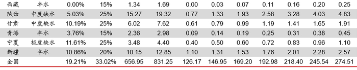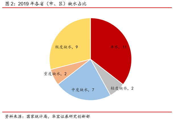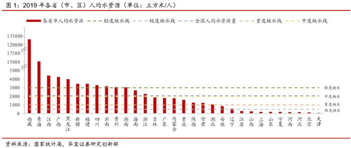 水资源短缺情况严峻,人均水资源区域分布不均。截至2019年,我国人均水资源量为2077.7立方米/人,略高于中度缺水线(2000立方米/人)。从各省(市、区)的分布来看,11个省(市、区)的人均水资源量在重度缺水线以下,2个位于重度缺水区间,7个位于中度缺水区间,2个位于轻度缺水区间。由此可见,我国水资源短缺情况较为严峻,经济发达省份大都属于缺水区域,呈现区域分布不均的形势。