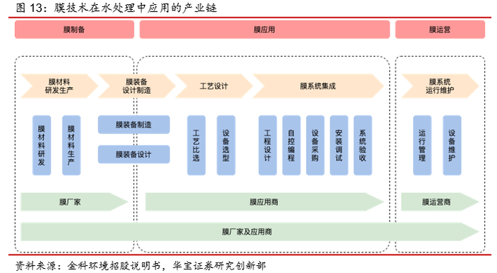 膜技术在水处理中应用的产业链包括膜制备、膜应用、膜运营三个环节,其中膜制备主要包括膜材料研发与生产,膜应用环节主要包括工艺设计、膜系统集成,而膜装备设计及制造则横跨膜制备和膜应用两个环节。由于产业链上的专业分工,上述环节上通常由不同的公司来承担。